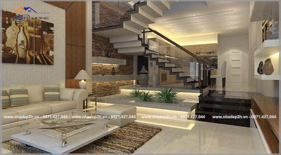 2H HOME xin tư vấn thiết kế & thi công nhà phố 5x20m² trở nên hiện đại. Phần không gian tầng1 được các kiến trúc sư của chúng tôi thiết kế liên thông không gian với nhau. Kết hợp giữa phòng khách và khu vực bếp, bàn ăn. Kết nối bằng không gian tiểu cảnh được thiết kế dưới gầm cầu thang. Vừa tạo mảng xanh cho căn nhà, vừa tạo được mối liên hệ giữa hai không gian sử dụng. Diện tích nhà phố 5x20m² tương đối lý tưởng để thiết kế một không gian sống đẹp và hiện đại.