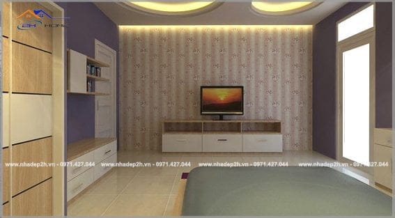 Kệ tủ tivi cũng được thiết kế một cách đơn giản, hiện đại. Màu trắng cho một sự sang trọng và sạch sẽ trong nội thất của gia chủ. Tivi treo tường để tiết kiệm không gian hơn là khi sử dụng kệ tivi. Kết hợp với những ngăn tủ kéo được thiết kế vuông vắn sử dụng cho nhiều mục đích lưu trữ của gia chủ.