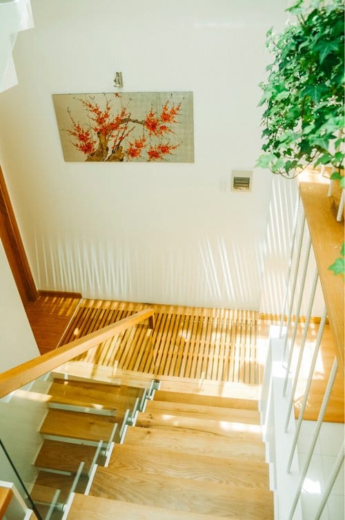 Phần cầu thang cũ của ngôi nhà được thay thế bằng hệ cầu thang gỗ có tay vịn bằng vật liệu kính, giúp không gian sáng hơn