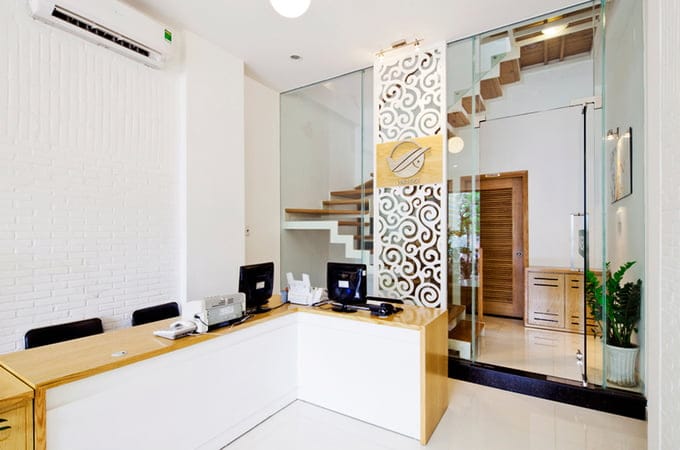 Tông màu trắng nhẹ nhàng và tinh tế là tông chủ đạo của ngôi nhà. Tầng 1 vẫn áp dụng làm văn phòng giao dịch. kết hợp thiết kế văn ngăn CNC và cửa kính cường lực tạo cho không gian trở nên sang trọng và rộng hơn rất nhiều.