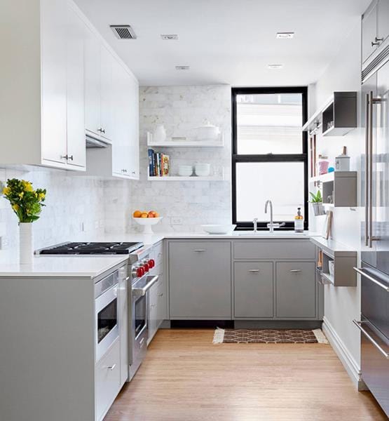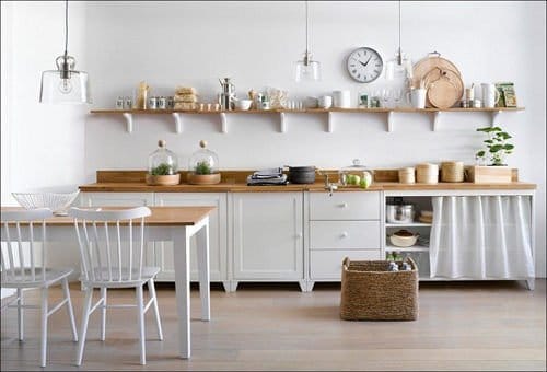 Các loại tủ tường có thể khiến cho không gian bếp trở nên nặng nề hơn. Trong khi đó, các loại giá, kệ vẫn có thể lưu trữ nhiều đồ đạc. Nhưng lại khiến cho tổng thể thoáng và thẩm mỹ hơn nhiều.